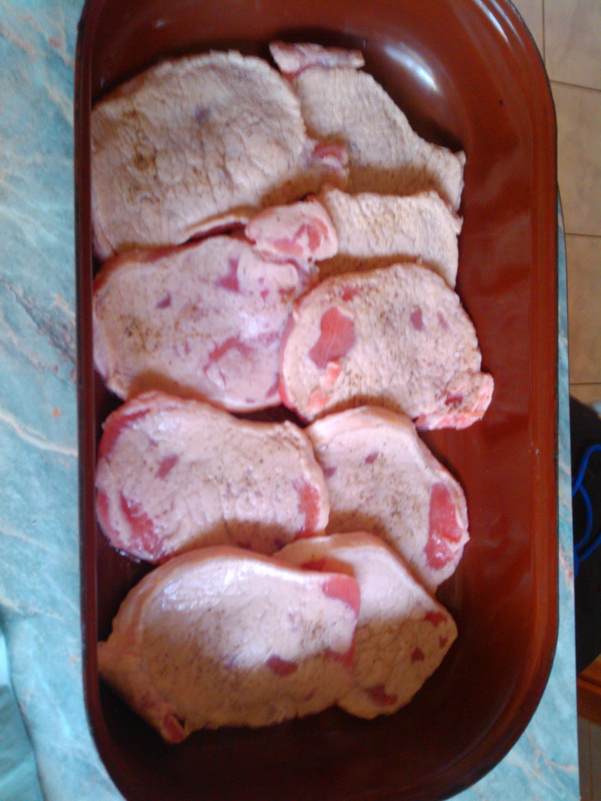 Először megtisztítjuk a szeleteket, kiklopfoljuk és mindkét oldalába beledörzsizzük a sót és a borsot. Ezután olaj nélkül picit megpirítjuk serpenyőben (így nem szárad ki sütésnél) és bepakoljuk a tepsibe.