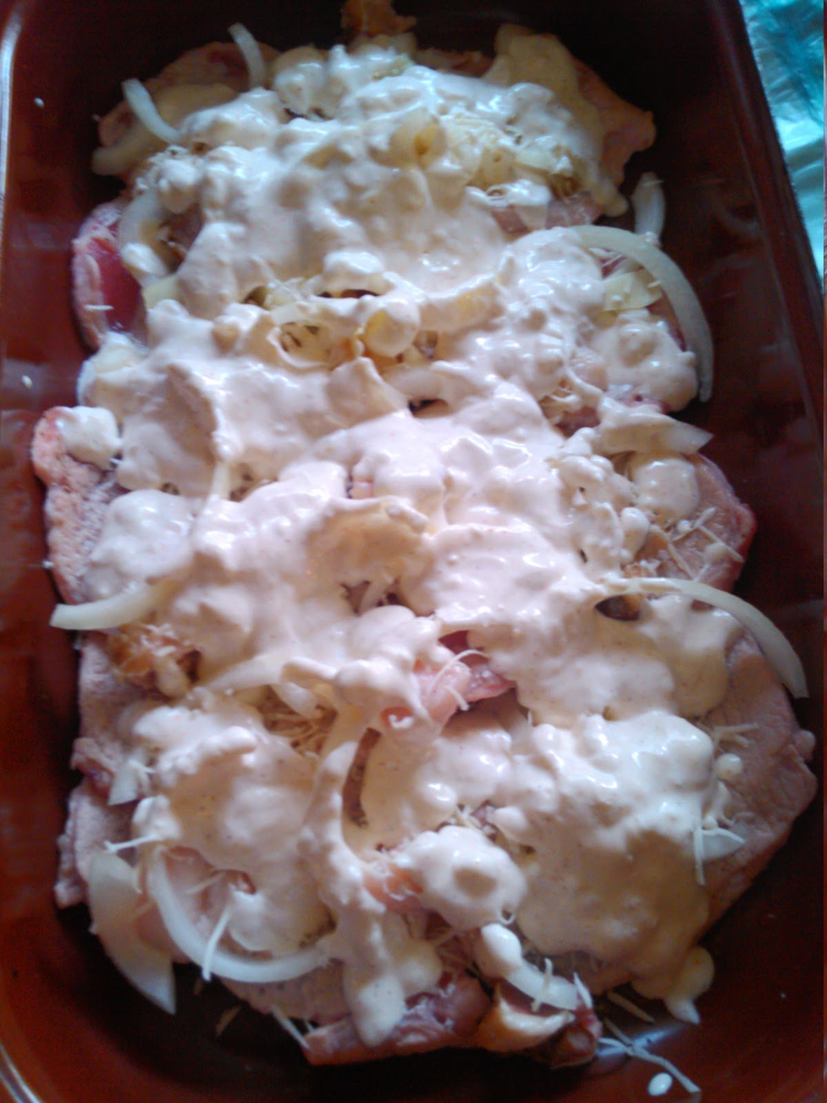 Bekeverjük a főzőtejszínt a tejföllel és a sajttal, ezt is befűszerezzük (só, bors, egyebek). Ezt a fincsi egyveleget ráborítjuk a husikra.