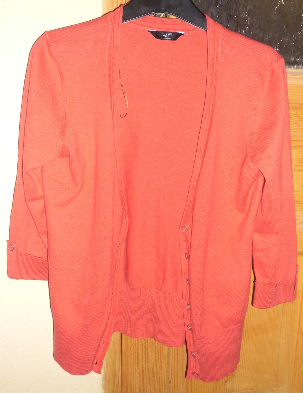 “Sajnos” kifogytam a kardigánjaimat, ezért be kellett szereznem egy újat. Szintén 3/4-es ujjú, kényelmes és ha a gombokat bejárom, tökéletes lesz 😀 A színe vérnarancs, szép vidám; az ára 2690.- volt.