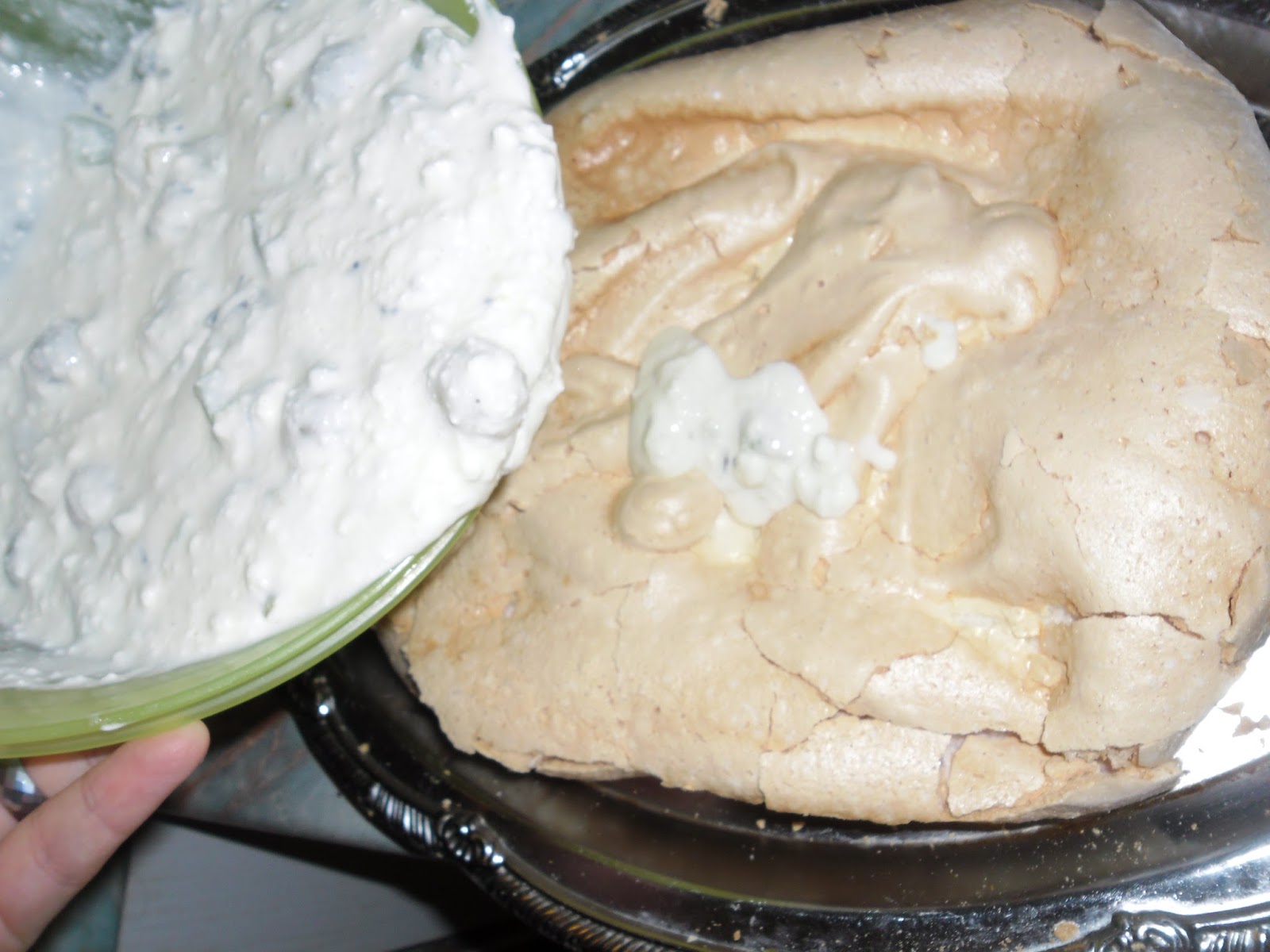 Sütőpapírral kibélelt tepsibe kanalazom, pici krátereket csinálok rá…ami tök fölösleges, mert baromi nagyra meg fog dagadni 😀 Bedobom a sütőbe 130 fokra kb. 50 percre, majd lekapcsolt sütőben hagyom fél óráig. Ha kihűlt, lehet rádobálni a krémet.